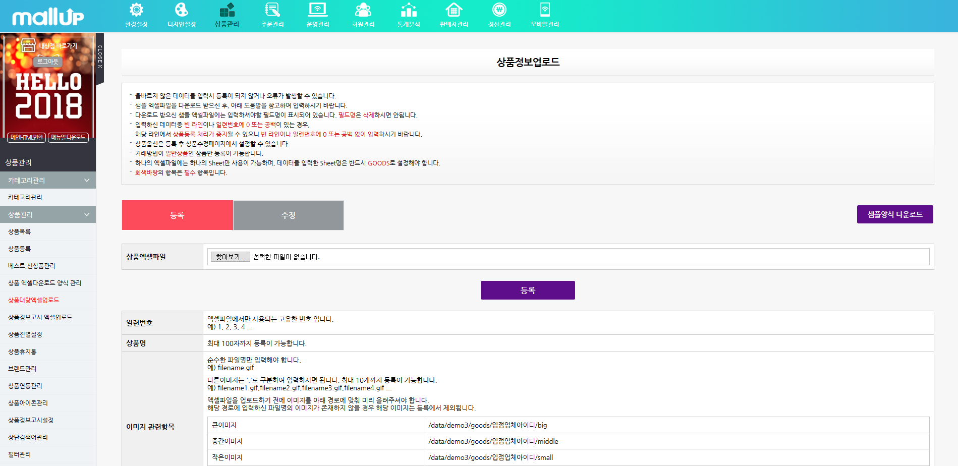 큰 이미지 | http://사이트url/data/사이트코드/goods/입점업체아이디/big or 링크주소로 입력 |