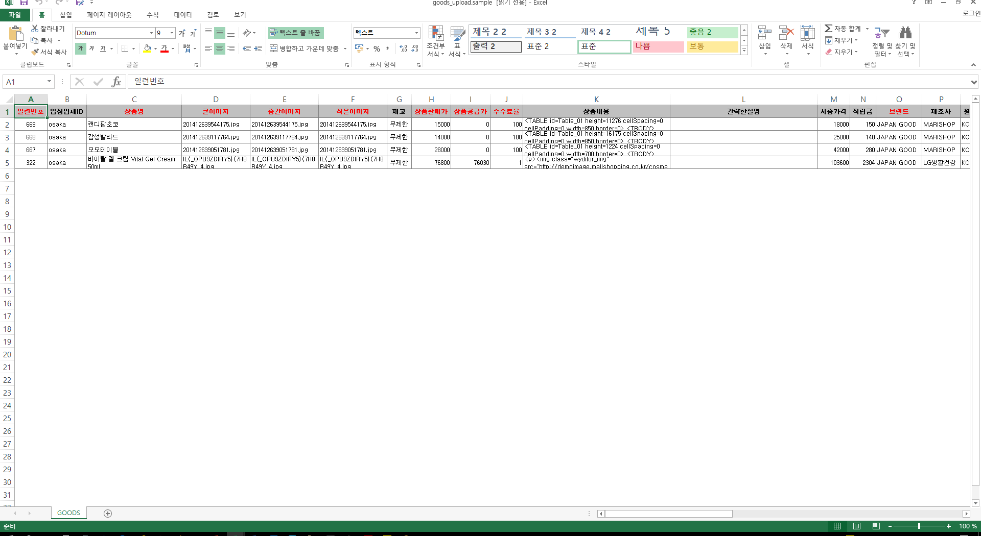 'goods_upload.sample'엑셀파일을 열면 위 이미지와 같이 세팅항목과 예제들이 나옵니다.
